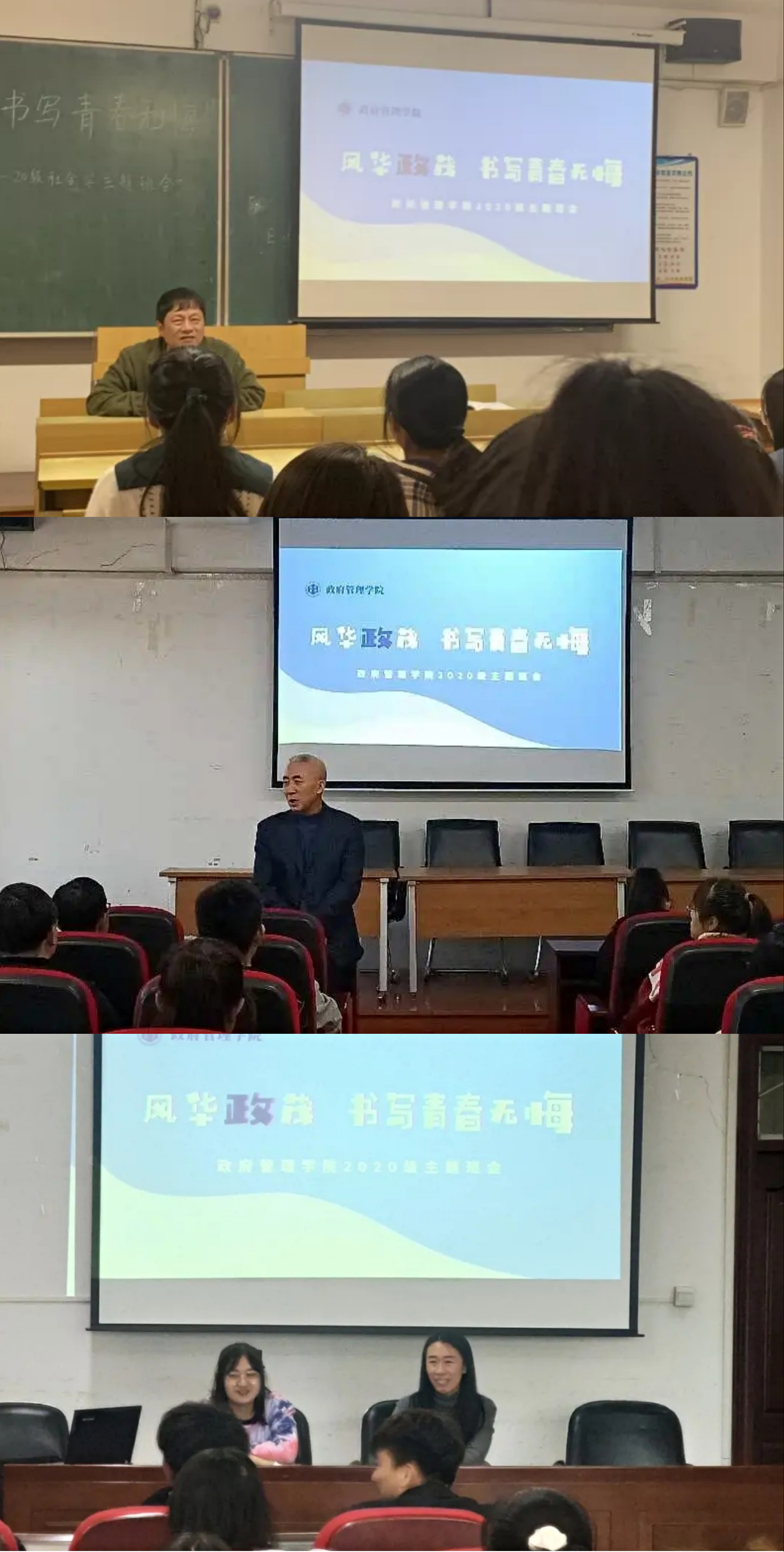 为响应学校号召,帮助2020级新生更快地建立团结奋进的班级集体,加强师生间的联系与交流,政府管理学院于10月6日至7日召开了“风华政茂,书写青春无悔”主题迎新班会。学院领导班子成员陈辉书记、教军章院长、夏欣副书记、袁洪英副院长和付传副院长相继走入2020级各专业班级,参加主题班会活动。