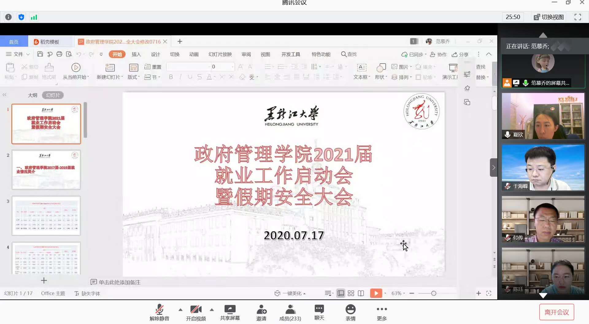 为积极响应学校号召,进一步开展就业动员工作,提升2021届学生的就业紧迫意识,同时做好假期安全工作布置安排,政府管理学院于6月18日19:30以腾讯会议为平台举办了2021届就业工作启动会暨假期安全大会。本次会议特邀学院党委书记陈辉老师、院长教军章老师、党委副书记夏欣老师、副院长袁洪英老师、副院长付传老师、各系系主任、各专业负责人出席,由2017级辅导员范慕乔老师主持召开,政府管理学院2017级全体学生及学生家长参加。