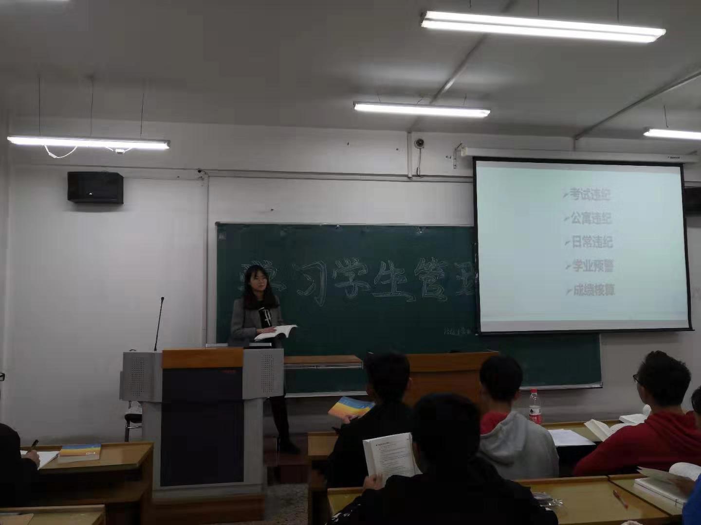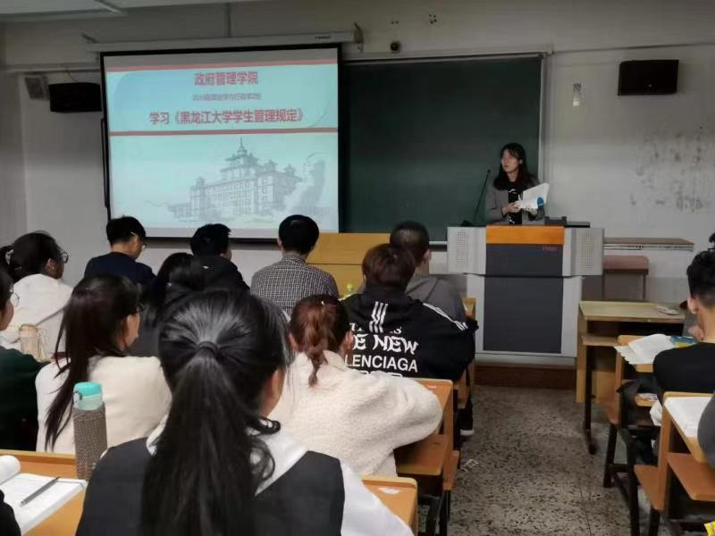 为进一步维护学校正常的教育教学秩序和生活秩序,规范2019级新生的日常学习生活,保障学生合法权益,培养德、智、体、美等方面全面发展的社会主义建设者和接班人,政府管理学院于第九、十周晚自习时间以班级为单位,集中学习《黑龙江大学学生管理规定》,2019级辅导员刘千瑞老师主持并为新生们进行讲解。