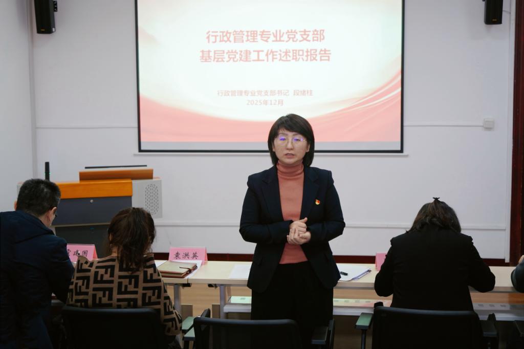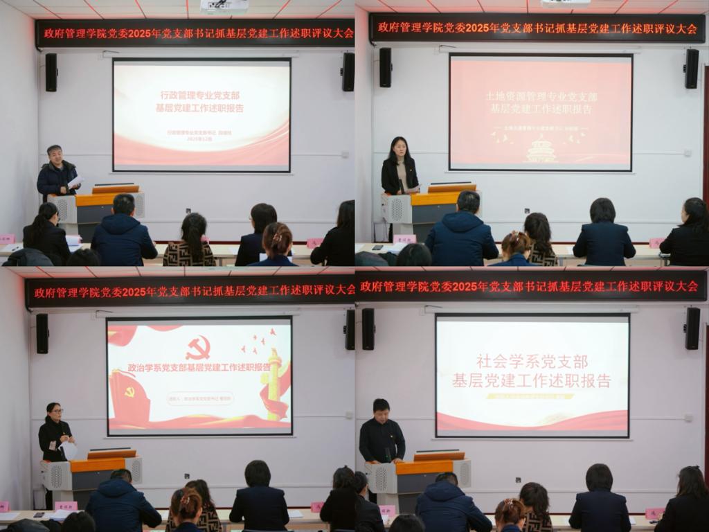 为深入学习贯彻习近平新时代中国特色社会主义思想,全面落实新时代党的建设总要求,整体提升党支部标准化规范化建设水平,政府管理学院于12月24日12:30在汇文楼942教室召开2025年党支部书记抓基层党建工作述职评议大会,学院党委委员、各党支部书记、党员代表参加会议。会议由学院党委书记王佳主持。