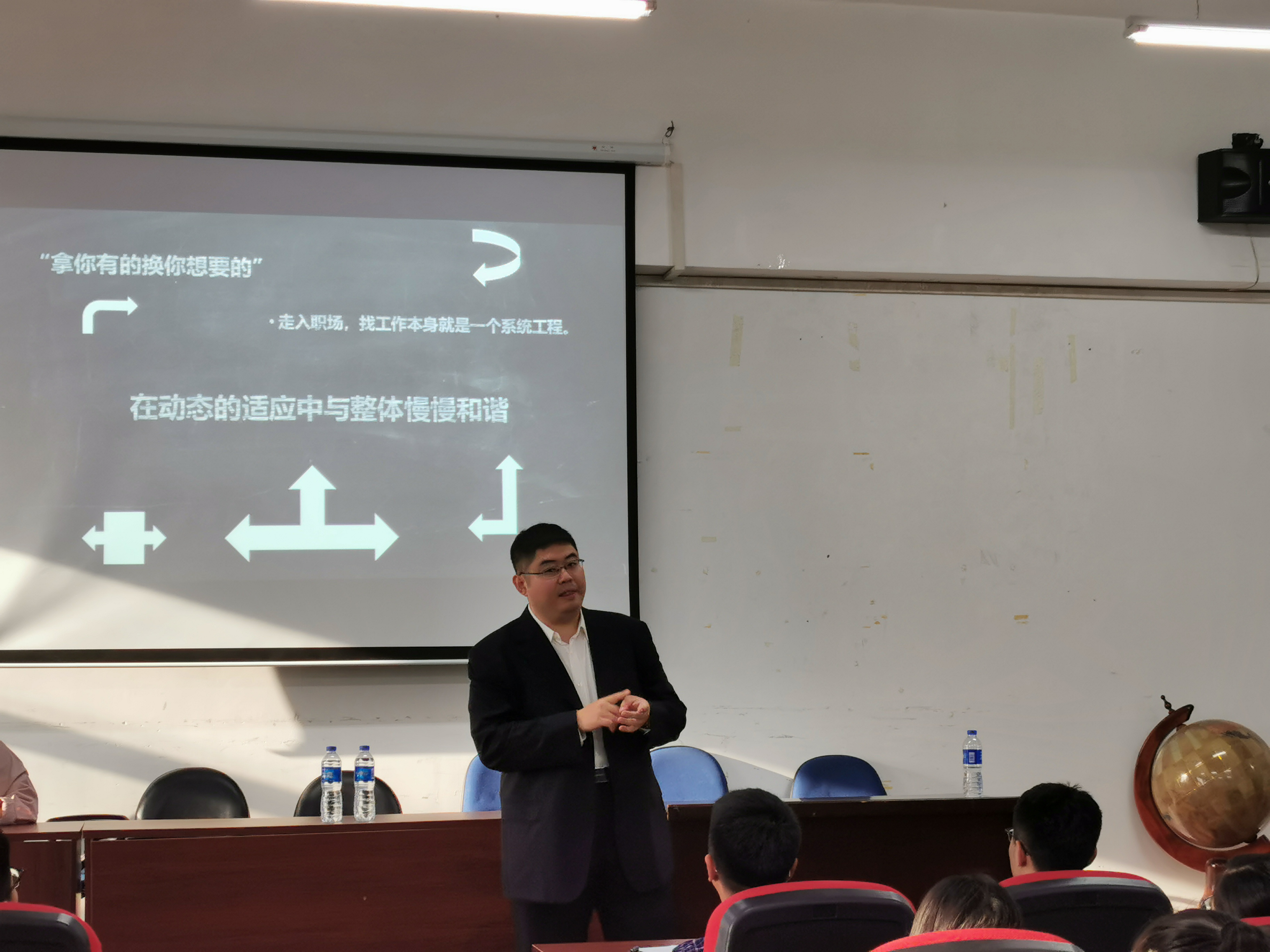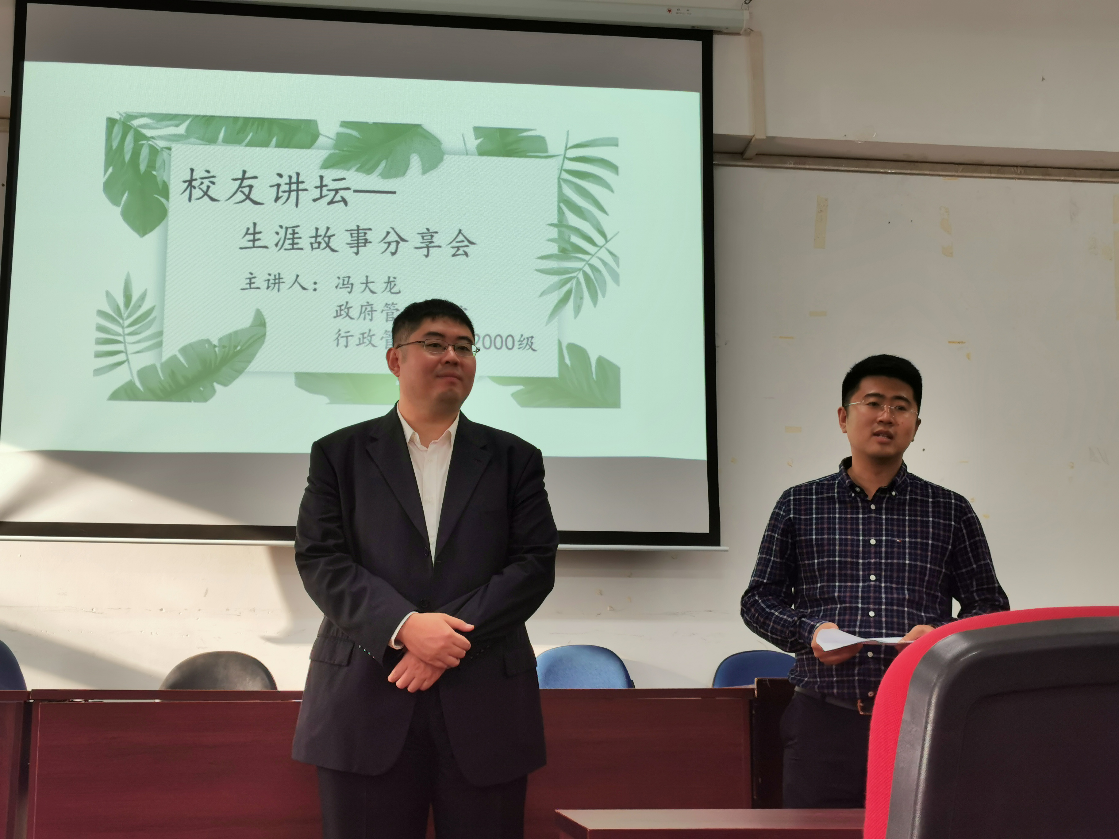 为切实加强对在校生的就业指导,提高大学生的职业规划能力,政府管理学院于9月27日15:30在汇文楼937室举办了以“职场、创业、成长”为主题的就业指导分享活动。本次活动由学院2000级行政管理专业校友冯大龙先生主讲,学院党委副书记夏欣、团委副书记张博及各年级学生参加了本次活动。