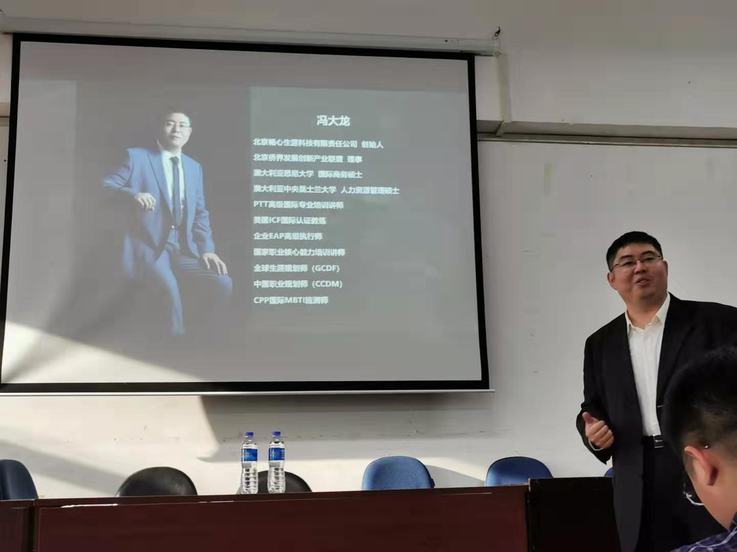 冯大龙校友现任北京畅心生涯科技有限责任公司创始人、PTT高级国际专业培训讲师、全球生涯规划师。活动伊始,冯大龙校友向同学们介绍了他个人毕业后的创业经历、不同阶段的人生感悟以及在母校学习的时光,他说:“每次回到黑大,都会有许多感动,校园的每一个角落都承载了我太多的梦想与回忆,希望通过我的报告能给学弟学妹们一些触动与帮助。”