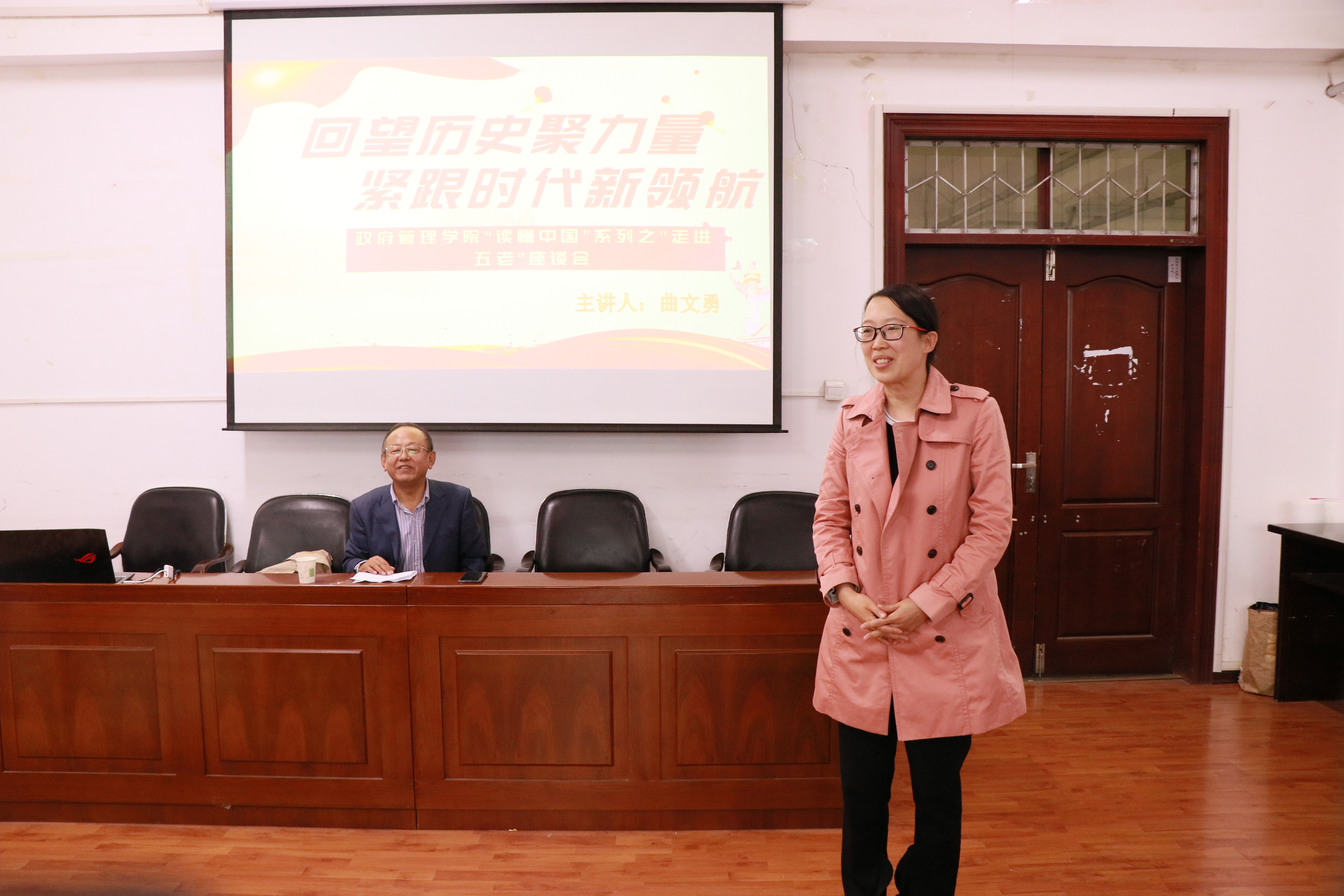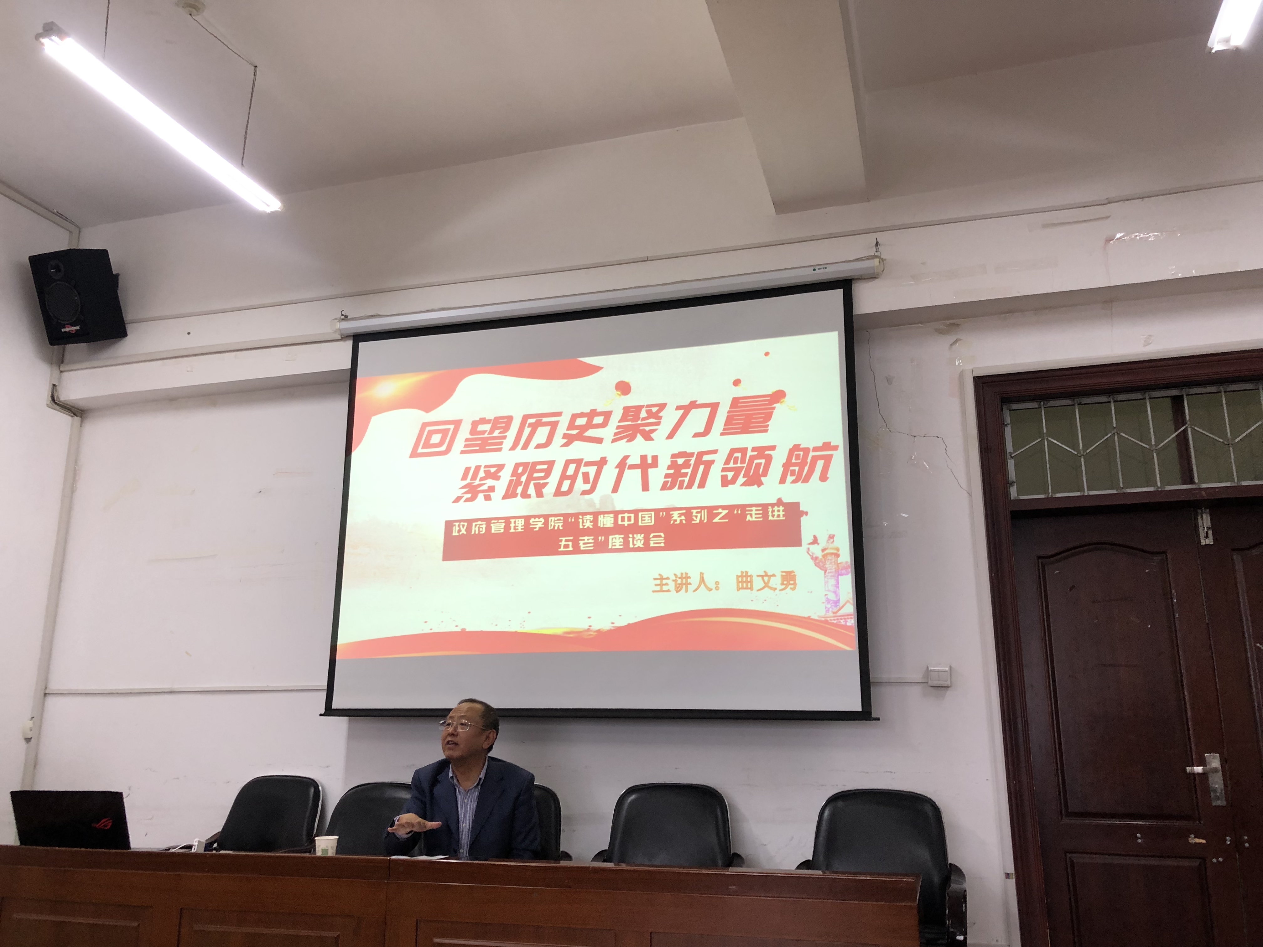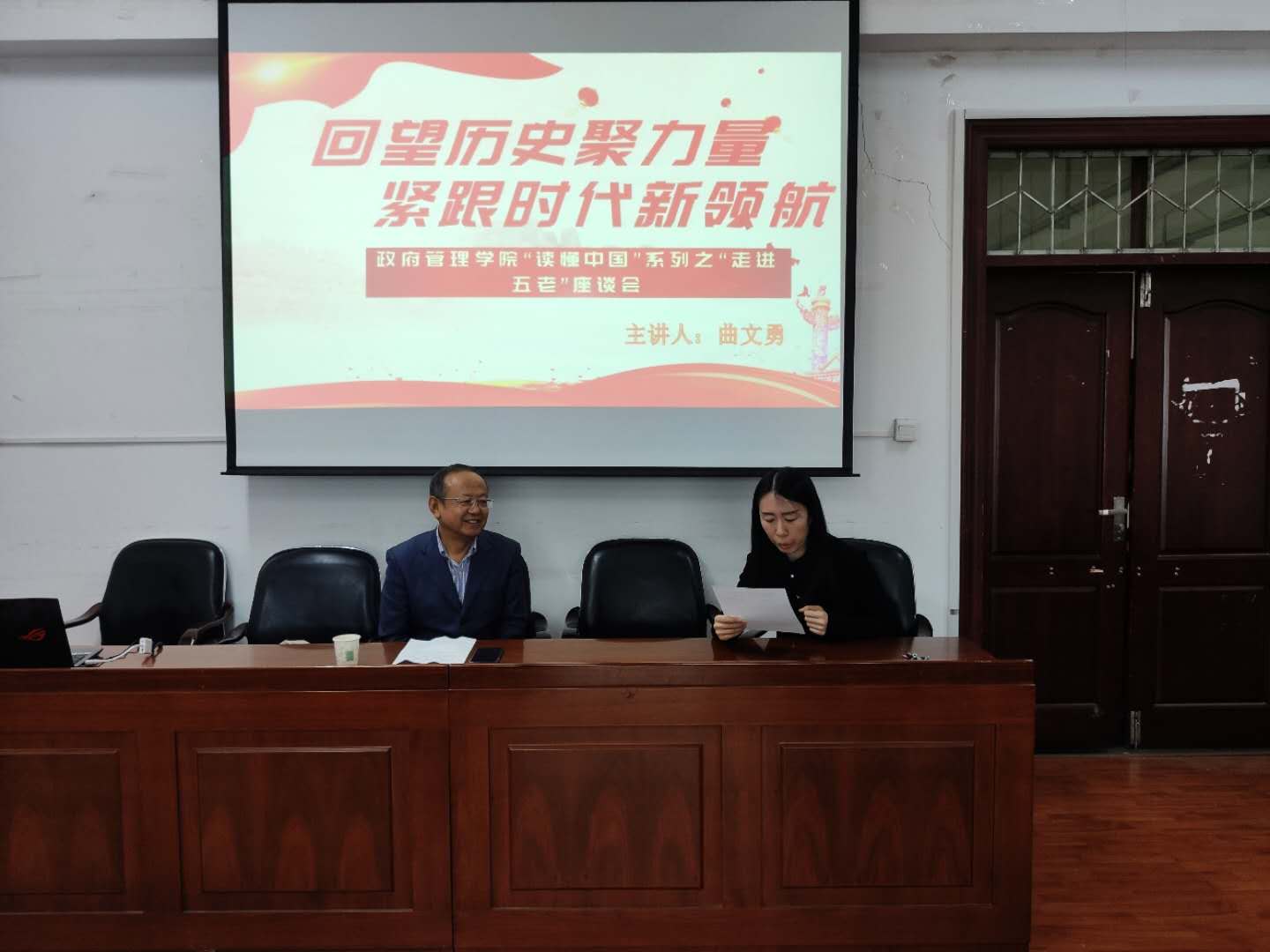 为深入贯彻全国教育大会精神,让更多的学生感受中国的伟大变革,深刻了解党史国情、校史校情,政府管理学院于2019年5月22日上午10:00在汇文楼942举行“读懂中国”系列活动之“走进五老”座谈会。此次座谈会主讲人为原社会学系主任、学科带头人、硕士生导师曲文勇教授,学院党委副书记夏欣,社会学系主任孙志丽,辅导员刘千瑞及2018级社会学、社会工作专业学生代表。
