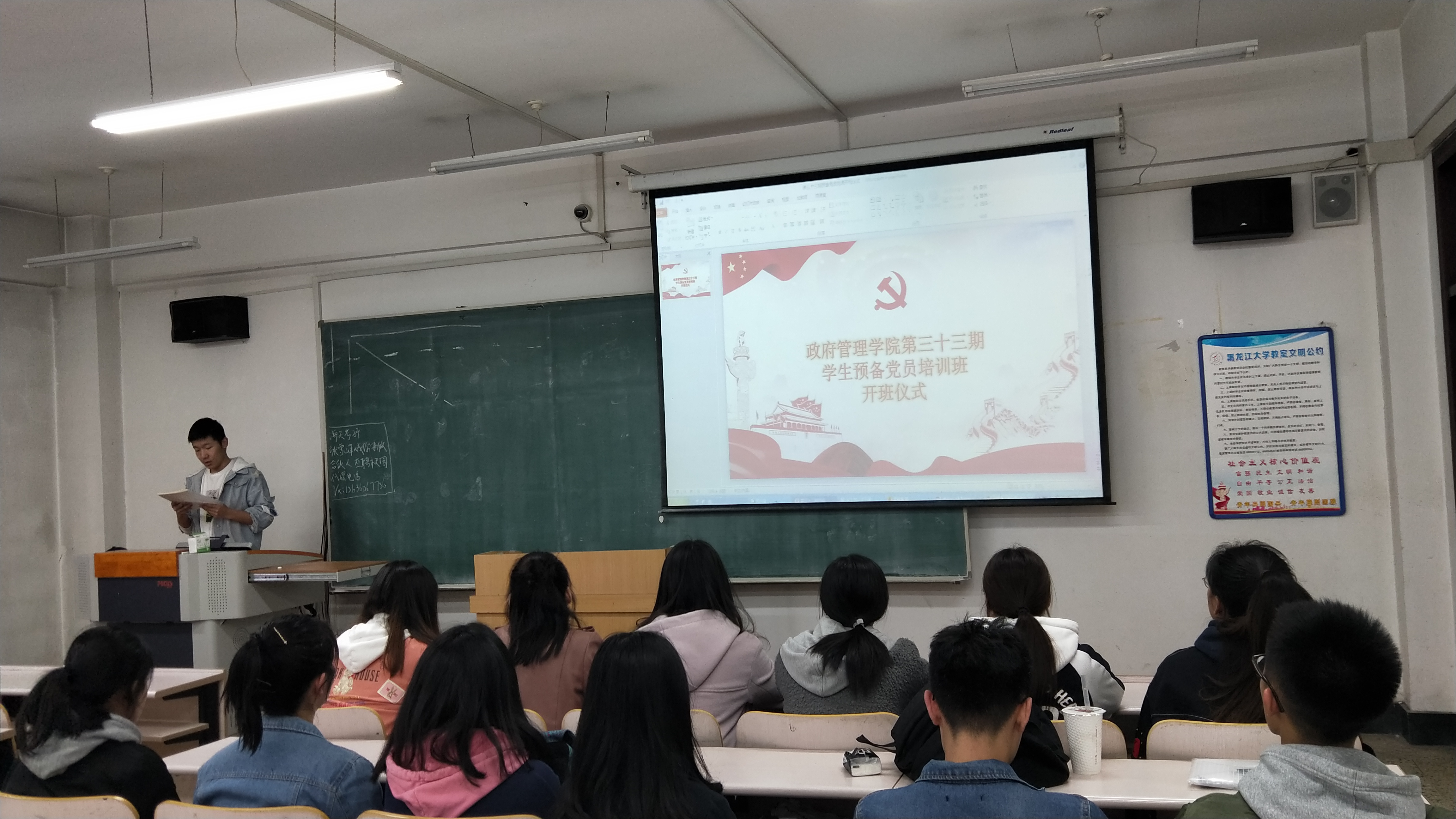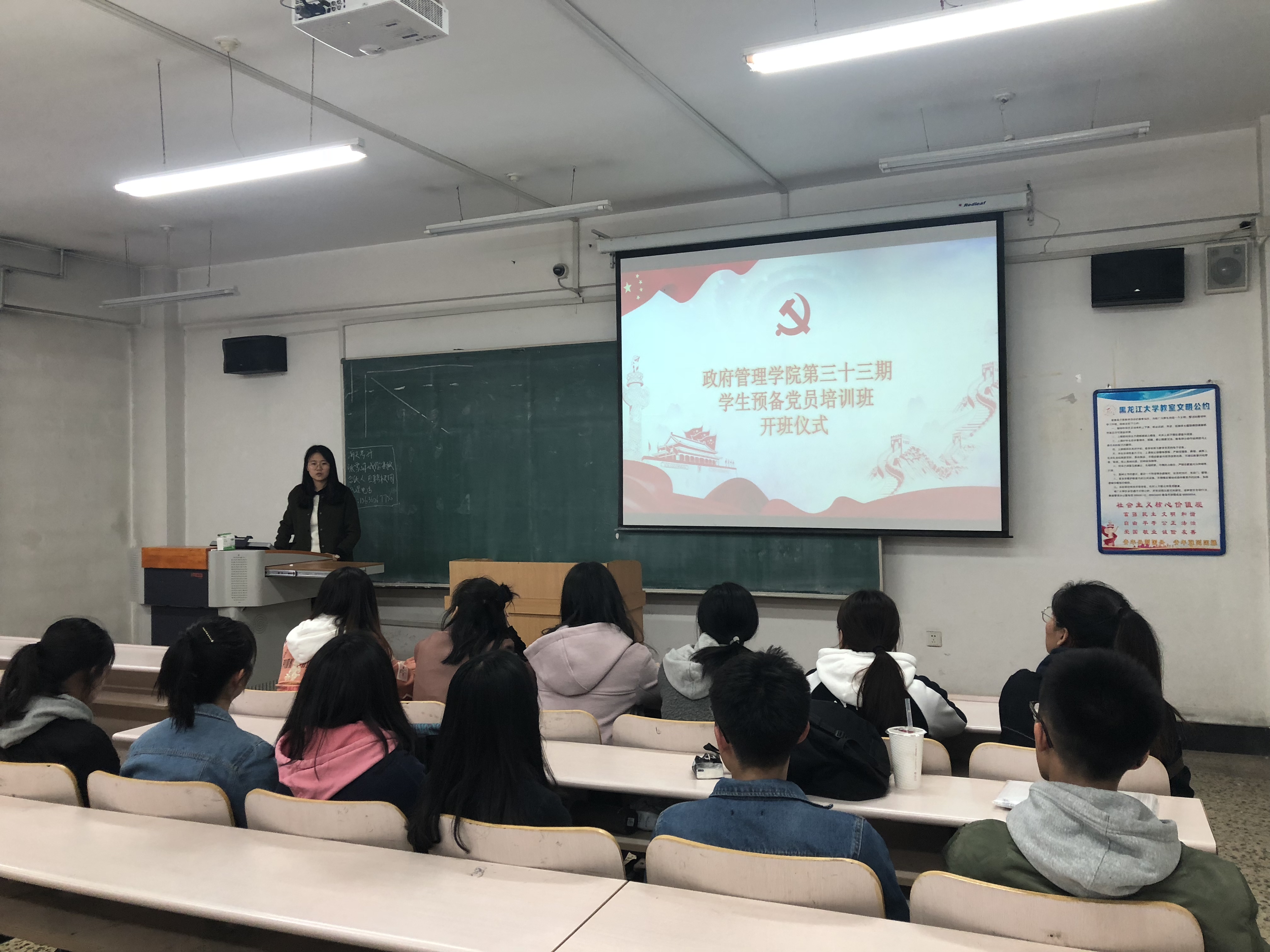 为进一步贯彻落实党的十九大精神,深入学习习近平新时代中国特色社会主义思想,积极响应学校开展预备党员培训班的号召,政府管理学院于2019年4月24日17:00在汇文楼262教室,开展第三十三期学生预备党员培训班开班仪式。会议由我院政治辅导员刘千瑞老师主持,16名培训班学员参加此次开班仪式。