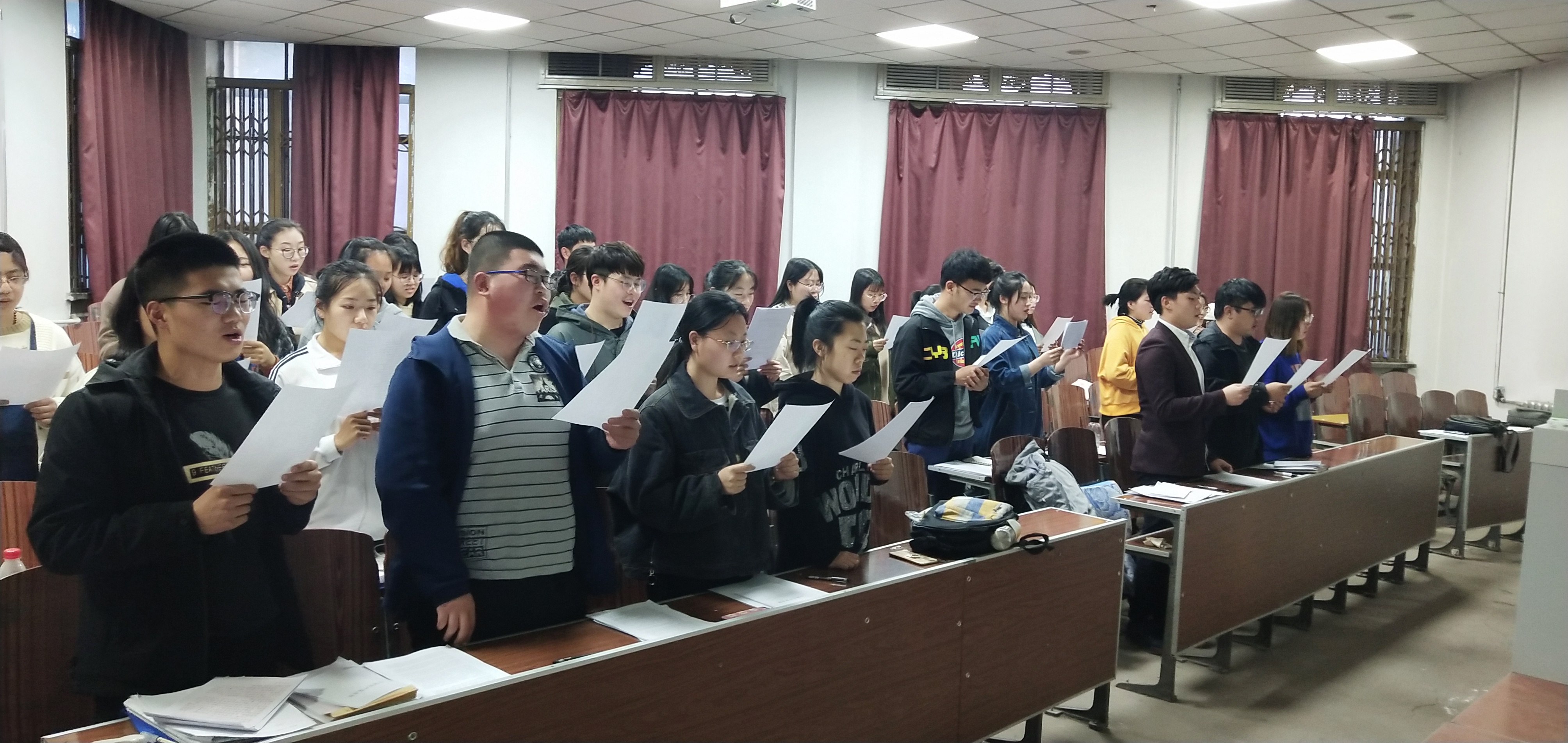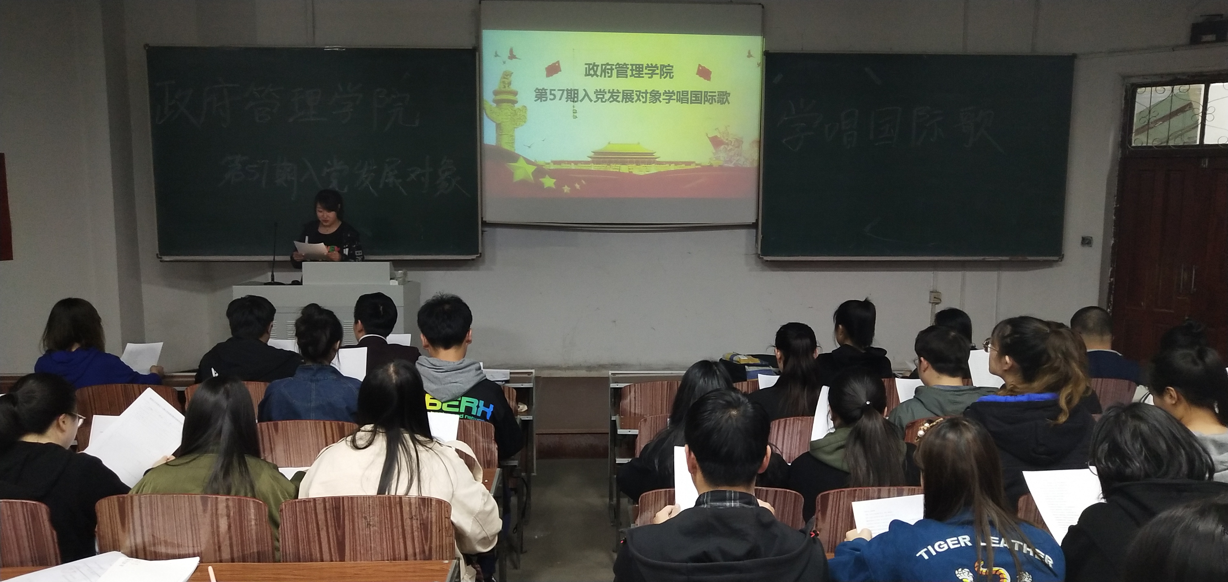 为提高我院新一批入党发展对象的党性修养和文化内涵,增强组织生活的仪式感,黑龙江大学政府管理学院第五十七期入党发展对象培训班学员于2019年4月21日晚18:00,在一号楼101教室集体学唱《国际歌》。