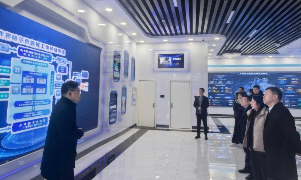 调研伊始,在杨海鲲局长的陪同下,袁洪英院长一行参观了齐齐哈尔市数据局的数据管理中心及智慧调度平台。相关负责同志详细介绍了数据局的组织架构、核心职能划分,以及数字化管理系统的体系设计、运行机制与实际成效。通过实时数据展示与典型案例解析,全面展现了齐齐哈尔市在数据资源整合、政务服务优化及城市智慧治理等方面的实践成果,为学院开展数字政府相关研究提供了鲜活的实践样本。